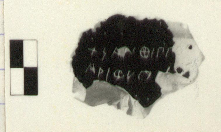 | Description: | Single fragment preserving the top of the stem and the bottom of the bowl of a kylix. On the interior is inscribed the name and patronymic of Xanthippos Ariphronos: <graphic> Pinkish-red, fine-grained fabric with good but peeling black glaze on both sides. Cf. Agora XXV, pp. 133-135. | |