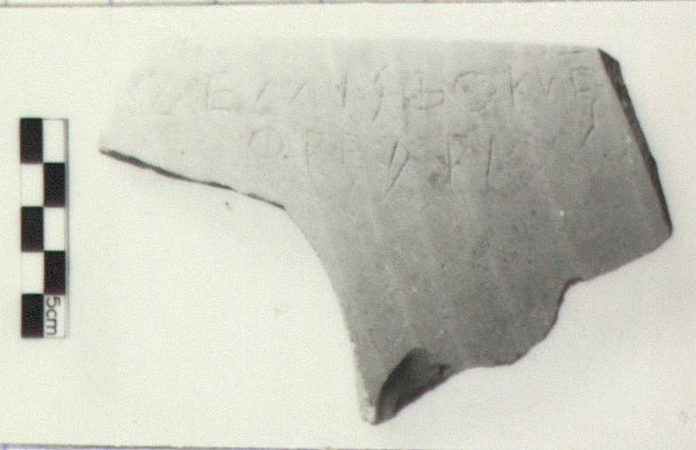 | Description: | Single fragment, broken all around, from the wall of a large closed vessel. Large coarseware sherd with the name and demotic of Themistokles inscribed on the exterior. <graphic> Orange, medium-grained clay with white inclusions. Buff exterior. Cf. Agora XXV, pp. 102-132. | |