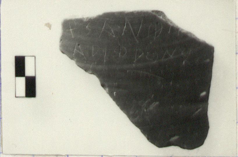 Description:   Single body fragment, broken all around. Matte reddish-brown wash on exterior; wheel ridges on interior. On exterior part of name and complete patronymic of Xanthippos: <graphic>