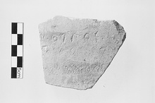 | Description: | Single fragment, broken all around. Wall fragment of a closed vessel, with wheel ridges on interior, exterior coated with a white wash. Lightly inscribed on the exterior is the end of the name and patronymic of Xanthippos: <graphic> Pinkish-orange, medium-grained clay with small white inclusions. Cf. Agora XXV, pp. 133-135. | |