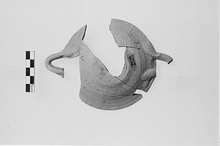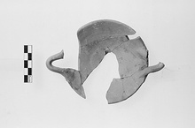 | Description: | Seven joining fragments preserving three-quarters of plate, one handle, and half of the other. Convex base with string marks, flaring walls, plain rim. Folded strap ribbon handles flattened to adhere (above and below) to the rim. Traces of thin red and brown wash on interior. Light orange-brown, fine-grained fabric. Red and brown slip. Cf. Agora XXIX, no. 1458; 290-250 B.C. | |