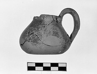 Description:   Small squat jug with vertical handle. Mended from several pieces. No base; the bottom left rough from the wheel. Short outward flaring lip. High handle from edge of neck to point of greatest circumference.