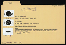 | Description: | Intact. Low ring foot with convex resting surface. Flat rim, sharply incurving. Horizontal handle attached at rim. Glazed black, with reserved resting surface, handle panel, and inside of handle. Stacking ring on outside. Fine-grained, pinkish-buff fabric. Cf. Agora XII, no. 747, ca. 480 BC. | |