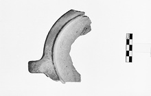 | Description: | Single fragment preserving nearly complete profile. Convex bottom, rounded junction with vertical wall. Projecting rim, interior with sharp raised ridge and groove for lid. Vertical strap handle, flattened oval in section, attached at base of wall and at lip, loop extending above rim. Coarse buff-pink clay with fine white and mica inclusions. Exterior surface gray with carbon. ADDENDA Fabric perhaps Phocaean, suggests J. W. Hayes. | |