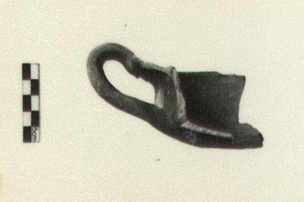 | Description: | Single fragment preserving nearly complete profile. Convex bottom, rounded junction with vertical wall. Projecting rim, interior with sharp raised ridge and groove for lid. Vertical strap handle, flattened oval in section, attached at base of wall and at lip, loop extending above rim. Coarse buff-pink clay with fine white and mica inclusions. Exterior surface gray with carbon. ADDENDA Fabric perhaps Phocaean, suggests J. W. Hayes. | |