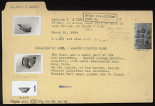 | Description: | The base and a small part of the rim preserved. Restored in plaster. Double curved profile, complete, with small horizontal rim. Ring foot. On the inside, at the center, deeply stamped palmettes and rosettes. Pinkish buff clay; glazed red to black. | |