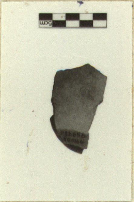Description:   Single fragment of base and floor, preserving one-quarter resting surface, half of base. Flat floor of a small open vessel. Projecting ring foot. Groove below junction with bowl projecting to a vertical edge; inturned, bevelled resting surface.