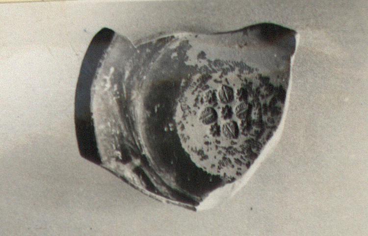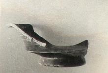 | Description: | The base and a small part of the rim preserved. Restored in plaster. Double curved profile, complete, with small horizontal rim. Ring foot. On the inside, at the center, deeply stamped palmettes and rosettes. Pinkish buff clay; glazed red to black. | |
