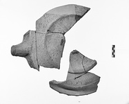 | Description: | Two non-joining fragments giving complete profile: a) 4 joining fragments, base to spout; b) 3 joining fragments from base to rim, with handle. Tip of spout missing. Large shallow basin with disk foot; wide, level, out-turned rim with single groove, lug handle with three spools; open spout. Light horizontal ridges on exterior of upper body. Coarse dark pink-buff clay with many large, red, gray and white inclusions; buff to gray core. | |