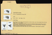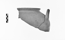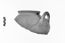 | Description: | Four fragments, three joining, preserving about one-third of chytra: part of rim and upper body, with one handle; one loose rim fragment. Spherical body, rounded shoulder, flaring out-turned rim with flat lip. Horizontal handles at junction of shoulder and body, round in section. Wide horizontal bands in red slip at upper shoulder, two preserved on body. Two horizontal grooves at level of handle attachment. Coarse orange-buff clay with white, yellow, gray and mica inclusions. Finished smoother on exterior. | |