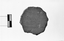 | Description: | Intact. Roughly circular clay chipped disk "counter", cut from body of large closed vessel. No preserved decoration. Clay pink 7.5YR 7/4-8/4. | |