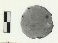 | Description: | Intact. Small, roughly circular chipped clay disk fashioned from the body of a large closed vessel. Original decoration does not survive, though "ghost" traces of two horizontal bands are visible under good light. Clay pink 7.5 YR 8/4. Cf. P 32704 to P 32717. | |