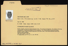 Description:   Nearly complete, except for missing fragment of rim. Two joining rim fragments. No evidence of burning. Ring foot. Broad neck; flaring rim with rounded lip. Two vertical handles attached from upper shoulder to neck, a finger or thumb impression at the base of each. Neck made separately from body. Exterior surface smoothed.
