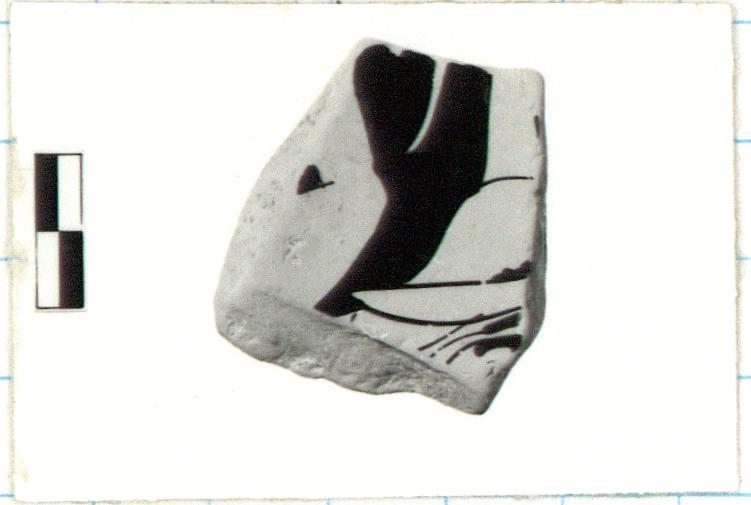 | Description: | Single fragment broken all around. Preserves part of stem and floor of cup. Single uneven groove on stem. Flat, low fillet at junction with foot. In tondo: archer crouching to left. Back view of torso, one arm extended holding bow. Bottom tail of bow preserved. Ear flap of Persian-style cap hangs down over back. Relief line: contour. Preliminary sketch: leg. Exterior: good black glaze. Cf. Agora XXX, nos. 1516, 1517, ca. 510-500 B.C. | |