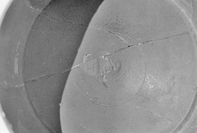 | Description: | Western Sigillata bowl broken but nearly complete. Low flaring base ring; gently concave floor; almost vertical side wall. Four grooves on the outside of the side wall. On the floor inside, traces of a stamp. Yellow clay; thin red glaze inside and out. | |