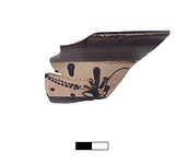 | Description: | Two joining rim and wall fragments. Concave, black glazed rim. Frieze preserves hasty palmette, tendril to right; branch with leaves, and blob-fruits in field at left. No incision. Below, black glaze with trace of reserved band. Reserved line on interior of lip. Streaky black glaze. Cf. P 32423, P 32424 and P 32474 and Agora XXIII, nos. 1541-1565. | |
