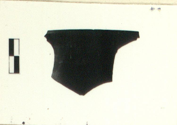 | Description: | Single fragment, broken all around. Straight near vertical wall, flaring at rim with tiny rim-flange. Fine gray-black ware; black slip, ending inside rim, polished on exterior. Eggshell ware. W. Asia Minor product? | |