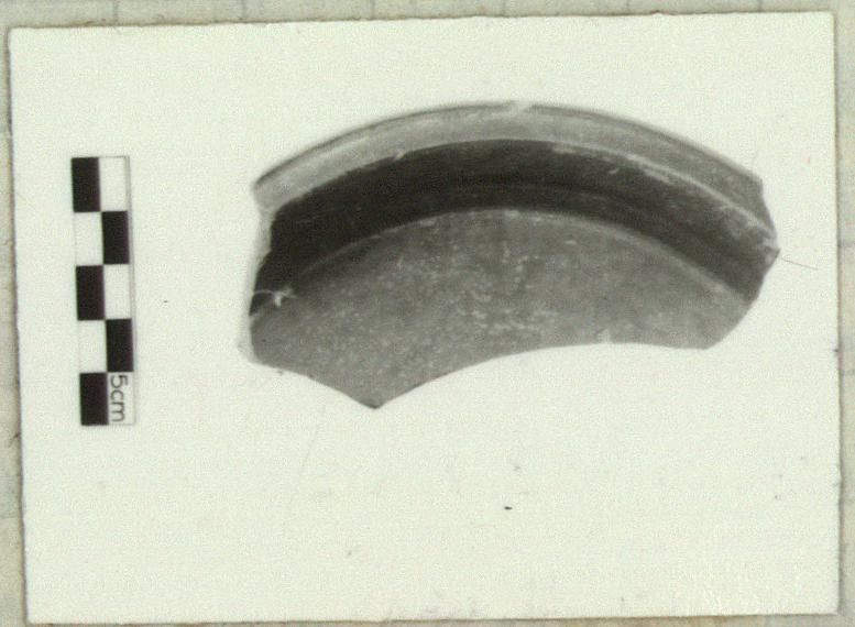 | Description: | Single fragment preserving one side of rim and wall. Shallow rounded wall (sloping on inside), concave floor; narrow downturned rim with flat lip, small mouldings at top and bottom edges, with slight rouletting between them. Stump of foot at inner break. Interior plain. Light orange-red clay, red gloss with minor flaking. Unclassified ware, possibly Sagalassos or Italian (?). Shape looks like late 1st. cent. B.C. | |
