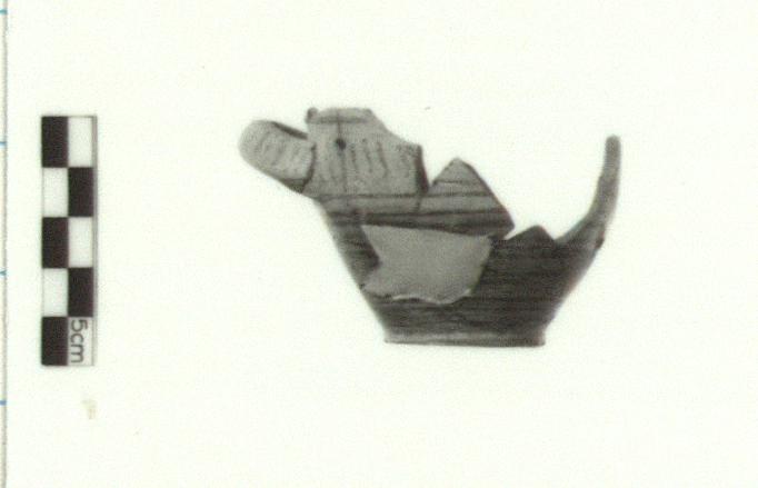 | Description: | Nine joining fragments preserving more than one-third of original vessel, including one handle, with full profile. One plaster filling. Glaze very worn and peeled. Early Protocorinthian kotyle of late 8th/ early 7th century BC. Deep body and gently incurving walls. Exterior: lower part painted solid, including small offset foot. Above, a series of four horizontal bands. Shoulder zone decorated with vertical squiggles. Vertical strokes on handle. Interior probably originally painted solid but glaze too badly worn to be certain. Buff Corinthian fabric; brownish to black glaze. | |