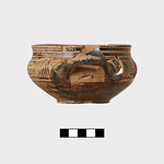 | Description: | Mended from many fragments; complete except for part of rim and gaps in body. Black paint unevenly worn, with only traces on one side, revealing clearly the beige slip on reserved area. Fairly deep, globular shape, with slightly everted, tall vertical lip; ring foot. Exterior decoration: three broad stripes on rim wall; shoulder panels between handles, of broad hatched maeander framed by four vertical lines, with rosettes in upper angle between panel and handle zone; lower wall, foot and resting surface painted solid, as are horizontal handles. Reserved: inside of handles, handle panels and underside of foot. Interior painted solid except for reserved band on inner lip and large dot at bottom of center. Buff fabric, with black glaze. Middle Geometric II. ADDENDA: Two joining body fragments added from Lot ΜΣ 508, not mended (Dec. 2020). See Coldstream (1968) pl. 5e (= Kerameikos V.I, no. 294, and p. 23; first or second third of 8th century BC.) | |