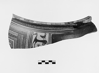 Description:   Single rim fragment preserving part of rim and upper body. Glaze very well preserved. Low, slightly flaring rim, flat on top. Rounded body. Scar from strap handle attached at rim, with slight nipple on exterior face of rim to left. Interior painted solid. Top of rim reserved, with sets of eleven cross-strokes (seven groups preserved). Exterior of rim carries zone of chevrons between horizontal bands, two above, three below. Complex shoulder decoration is as preserved from lower left: hatched maeander with band below, framed above by a zone of three zigzags enclosed between bands, above it a zone with single zigzag; to the right, respectively and all enclosed between bands, 1) a zone with the same kind of single zigzag but vertical , 2) a zone of stacked M-ornament, 3) a panel with a horse facing left and star between legs and a right-facing bird above on rump (all in silhouette). To right of panel, under handle area, shoulder painted solid.