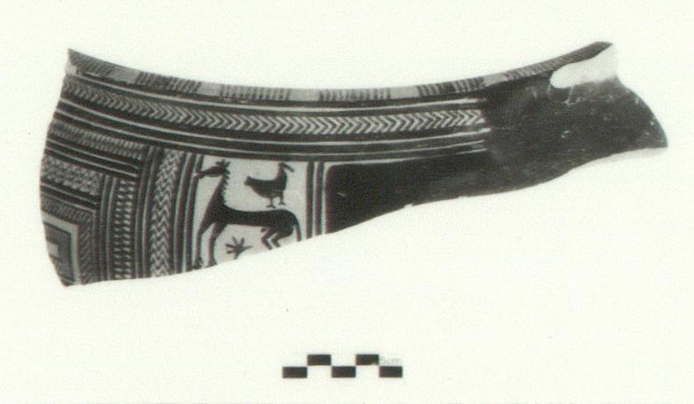 | Description: | Single rim fragment preserving part of rim and upper body. Glaze very well preserved. Low, slightly flaring rim, flat on top. Rounded body. Scar from strap handle attached at rim, with slight nipple on exterior face of rim to left. Interior painted solid. Top of rim reserved, with sets of eleven cross-strokes (seven groups preserved). Exterior of rim carries zone of chevrons between horizontal bands, two above, three below. Complex shoulder decoration is as preserved from lower left: hatched maeander with band below, framed above by a zone of three zigzags enclosed between bands, above it a zone with single zigzag; to the right, respectively and all enclosed between bands, 1) a zone with the same kind of single zigzag but vertical , 2) a zone of stacked M-ornament, 3) a panel with a horse facing left and star between legs and a right-facing bird above on rump (all in silhouette). To right of panel, under handle area, shoulder painted solid. Fine orange fabric. Shiny good quality dark brown glaze. For a similar scheme of decoration, cf. that on globular pyxis Paris A 514 (Coldstream (1968), pl. 4E.). Style is MG II. | |
