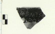 | Description: | Two joining fragments of an open vessel (large bowl?) chipped on exterior and on rim. Reddish-brown glaze on exterior, orangey-red on interior. Rim reserved. Incised on exterior partly preserved name and patronymic of Themistokles: <graphic> Micaceous reddish-yellow fabric. Joins P 32956 and P 32556. Cf. Agora XXV, nos. 664-1049. | |
