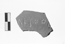 | Description: | Single wall fragment of thin-walled cooking vessel. Incised on exterior, from left to right, part of name: <graphic> Dot theta. Micaceous orange fabric fired gray on exterior. | |