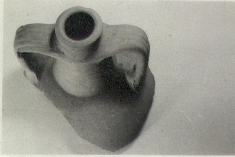 Description:   A single piece, preserving both handles, neck and mouth, and some of the shoulder. Neck tapers toward top. The dipinto in green. The handles ribbed.