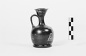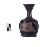 Description:   Complete except for large hole in body and small pieces of rim. Ring foot with concave moulding on inner face, reserved underneath; plump, squat body. Neck offset from shoulder, high outflaring rim. On front, a reclining deer, facing left.