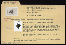 Description:   From a krater? Black glaze inside. The representation is not clear. Probably, at the top, the thighs of a striding figure, with the edge of a short chiton. Below and at the right, the lower leg and sword of a fallen or falling figure. In front of both these, a horse's foreleg.