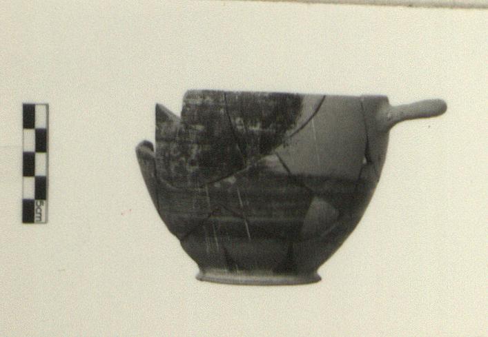| Description: | Mended from many fragments, preserving almost complete vessel, except for missing fragments of body, rim and one handle. Paint worn. Low flaring ring foot; lower wall rising steeply to vertical upper wall; plain rim, slightly incurved. Horizontal handle, round in section, attached immediately below lip. Paint on interior and exterior poorly fired. Ring on underside, with large dot at center. Thin band on outer face of foot, another at juncture with wall. Lower wall decorated with rays; thin band above. Remainder of body to rim painted solid. Band of added red superimposed on black at the bottom of the area painted solid. Interior painted solid. For similar Attic kotylai imitating late Protocorinthian and early Corinthian, see Agora VIII, p. 51, pl. 9, nos. 166-168. | |