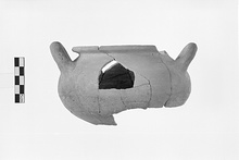 Description:   Mended from many pieces, missing bottom and half of rim. Broad-bellied depressed globular body (base rounded?), sharply everted rim. Two arched rolled handles set near-vertically (one tilted) on shoulder.