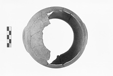 Dimensions:   Diam. (rim) 0.117; Est. Diam. 0.153; P.H. 0.095; W. (w/ handles) 0.17