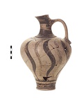 | Description: | Mended from many fragments (one loose fragment). Complete except for gaps on body. Dark brown paint well preserved, reddish where more dilute. Piriform shape with high, wide shoulder. Long tubular neck, cut away at back where handle attached and tipped forward for pouring in front. Flat sloping lip. Raised ring at base of neck, vertical ridged handle. Splaying (disc) foot, slightly concave below. Decorated with long curving stripes running vertically from shoulder to lower wall, one broad stripe alternating with group of three narrow stripes, framed by a band above and below. Wide band just above foot. Entire neck, inside of rim and exterior handle glazed. Ring of dots around shoulder at neck. Pale fine buff fabric with creamy slip on surface; dark brown paint. Addenda 2024: Fine light brown (7.5YR 6/4) fabric with gray core, as well as rare subangular small reddish-brown and dark gray inclusions. Argive. LH IIIA1 Early. Base has better parallels in LH II but motif does not begin until LH IIIA1 (e.g., RMDP I, p. 255). | |