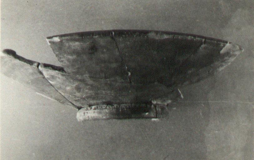 | Description: | Much of side wall and rim missing. High base ring, coarsely moulded; deep body; the rim thickened by being rolled inward. Buff clay covered with dull black glaze. | |