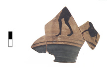 Black glazed lower wall. Two black glaze lines above, the upper fading out. Figural zone preserves: a) bottom half of male to left, female running to right; b) one foot and skirt of female running right, male to left. No incision. Added red dots on women's skirts.