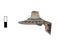 | Description: | Three joining fragments of neck, shoulder, and top of wall. Thin neck with narrow opening. Light offset at junction with shoulder. Rays and tongues on shoulder. Shoulder meets black glazed wall at sharp angle. White ground on neck and shoulder. Added red double line at top of wall. Fine pink-orange clay; dull black glaze. | |