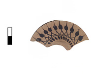 | Description: | Single fragment of shoulder and start of wall. Slight offset at junction with neck. Row of tongues and hanging lotus buds. Sharp angle at junction with wall. Wall black glaze with added red double line at top. Fine orange fabric; shiny black glaze. | |