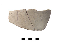 | Description: | Two joining fragments of shoulder. Coarse, gritty pink clay, buff on surface, with red and white inclusions and fine mica. On exterior incised: <graphic> | |