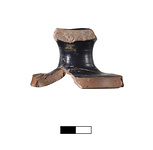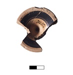 | Description: | Three joining fragments of foot and stem. Concave vertical face on foot. On underside, rising cone. Glazed on exterior except for face of foot. A glazed band on underside. Incised on resting surface: <graphic> Fine orange clay, shiny black glaze. | |