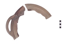 | Description: | Pan with handle. Two non-joining sections preserving less than half of circumference, with one handle and trace of floor. Straight, outwardly inclined wall with offset on inside. Flat bottom. Spreading wall. Handle, round in section, attached off rim. Soft, gritty fabric ( 5 YR 5/4). | |