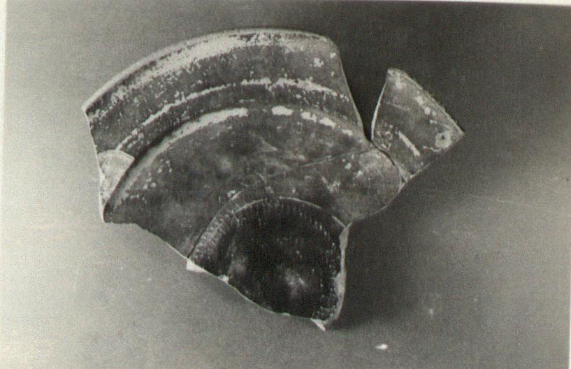 | Description: | About one-quarter remains. High ring base; shallow bowl; broad offset rim with outer edge slightly upturned. Buff clay; metallic black glaze which has flaked badly. Traces of stacking on the floor. | |