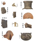 | Description: | Single fragment preserves one handle and ca. one-fifth of rim and upper wall. Sloping shoulder curving in at bottom. Straight outwardly inclined rim, flat on top. Slight flange for lid inside. Handle found in section, horizontally set on upper shoulder hugging wall. Hard, gritty fabric, reddish-brown (2.5YR 5/4) inside, brown (7.5YR 4/2) outside. Many sparkling inclusions, large voids. | |