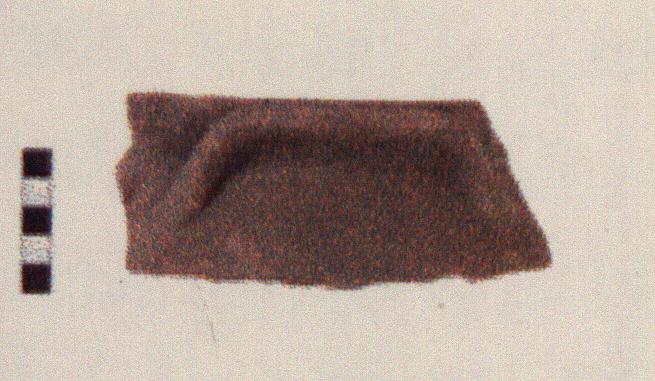 | Description: | Single fragment preserves one handle and ca. one-fifth of rim and upper wall. Sloping shoulder curving in at bottom. Straight outwardly inclined rim, flat on top. Slight flange for lid inside. Handle found in section, horizontally set on upper shoulder hugging wall. Hard, gritty fabric, reddish-brown (2.5YR 5/4) inside, brown (7.5YR 4/2) outside. Many sparkling inclusions, large voids. | |