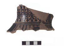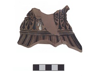 Description:   Two fragments of neck and shoulder of a neck amphora. Stump of one handle. On neck between handles lotus and palmette chain without incision. Raised ridge at bottom of neck. Alternating red and black tongues at top of shoulder. On fragment (a) the crest of a helmet intruding into tongues.