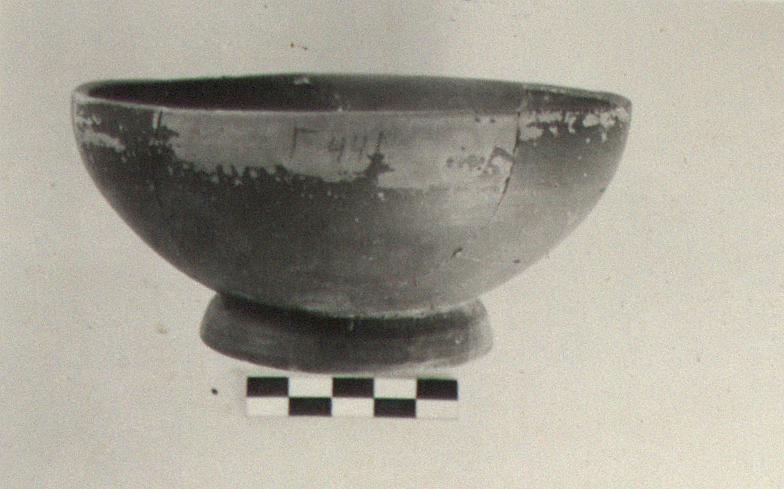 | Description: | Broken and lacking fragments from the side and rim. Restored in plaster. High flaring base ring. Hemispherical bowl. Lip flat on top and sloping inward. On the floor, a double circle of light rouletting. Thin fabric; metallic black glaze, inclined to flake. | |