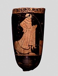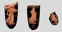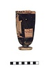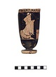 | Description: | Four joining fragments preserve base and almost complete body. Missing handle and parts above shoulder. Surface blackened inside. On reserved groundline, female in mantle striding right toward garlanded altar. Reserved: band below shoulder with maeander between two lines, outer face of foot and underside. Disk foot with hollowed cone at center. Orange fabric. Matte black glaze, cloudy, dilute and streaky on lower body. | |