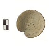 | Description: | Nearly complete: missing part of rim and side. Shallow bowl shape. Flat base with string marks. Pale buff creamy fabric. | |