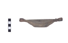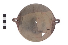 | Description: | Mended from many fragments. Complete except for two small gaps in body. Wall concave-convex on the outside, conical on the inside. Flat base, warped, with string marks and center cracked through firing. Tightly pinched ribbon handles. Pale buff clay with inclusions. Orange wash splashes on surface inside and out, red-brown glaze at handles. | |